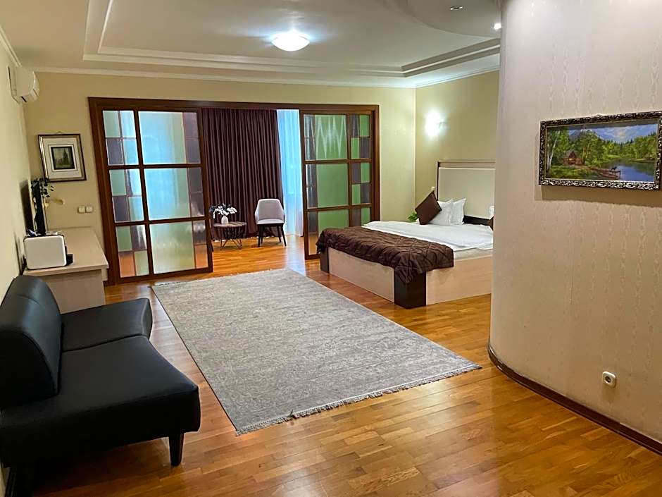 After a day of exploring Almaty's vibrant streets, return to the welcoming ambiance of and unwind in comfort. The hotel’s warm and friendly atmosphere is complemented by a lush garden terrace where you can sip a hot coffee or simply enjoy the fresh air with mountain views in the background. It’s the perfect spot for a peaceful moment before heading out again to uncover the city’s hidden treasures or relax with some downtime after a busy day sightseeing.